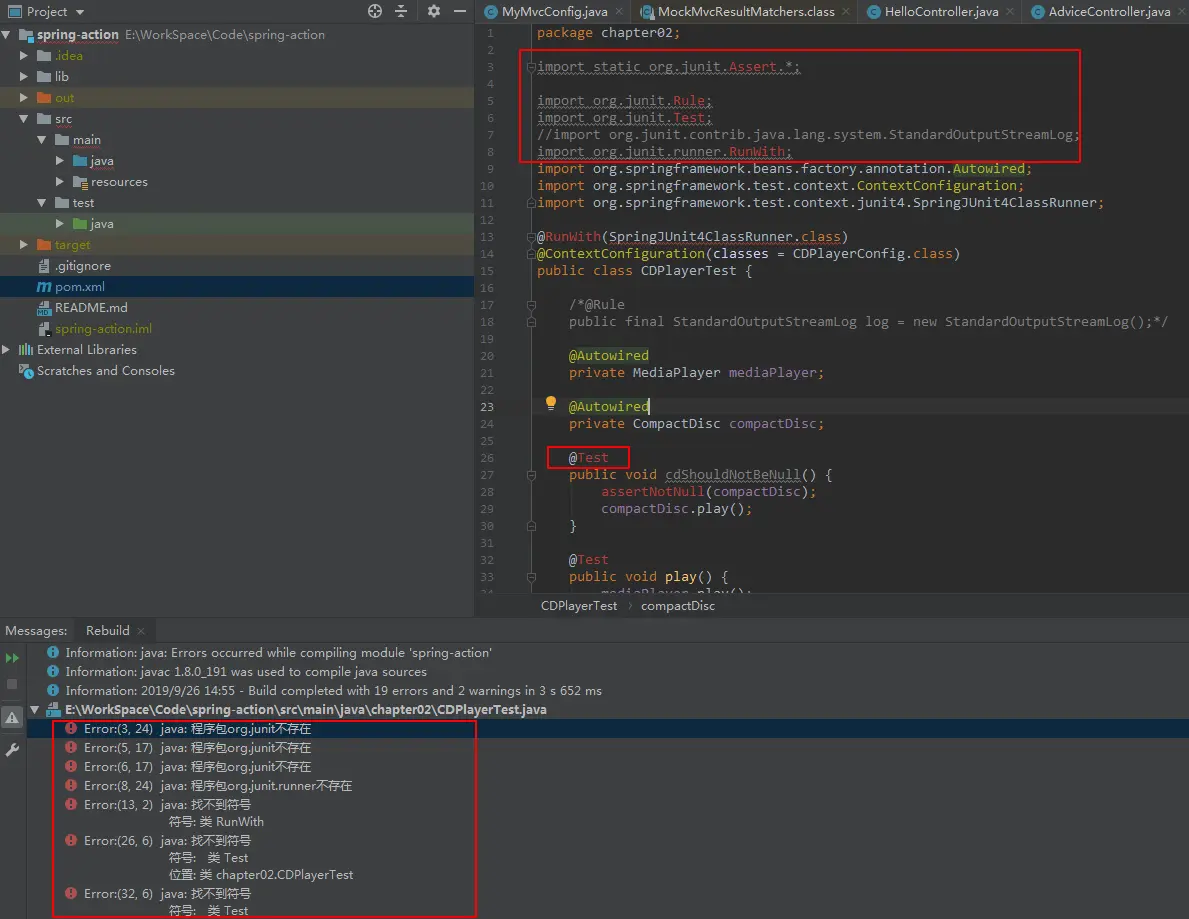 这是因为,我们在之前添加测试代码时,都是放在src/main/java目录下的,现在依赖包增加了<scope>test</scope>,说明这些包的存活周期是在test周期,所以我们可以把之前的测试代码移到src/test/java目录下,如下所示: