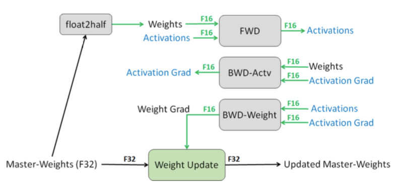 在前向和反向时使用FP16,整个过程变成:权重从FP32转成FP16进行前向计算,得到loss之后,用FP16计算梯度,再转成FP32更新到FP32的权重上。这里注意得到的loss也是FP32,因为涉及到累加计算(参见下文)。