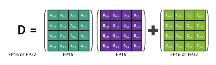 经过实验,作者发现将FP16的矩阵相乘后和FP32的矩阵进行加法运算,写入内存时再转回FP16可以获得较好的精度。英伟达V系列GPU卡中的Tensor Core(上图)也很支持这种操作。因此,在进行大型累加时(batch-norm、softmax),为防止溢出都需要用FP32进行计算,且加法主要被内存带宽限制,对运算速度不敏感,因此不会降低训练速度。另外,在进行Point-wise乘法时,用FP16或者FP32都可以,引用原文感受以下: