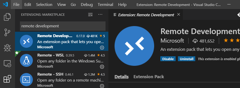 打开 VS CODE ,单击扩展选项卡,然后搜索 remote development 并安装它。