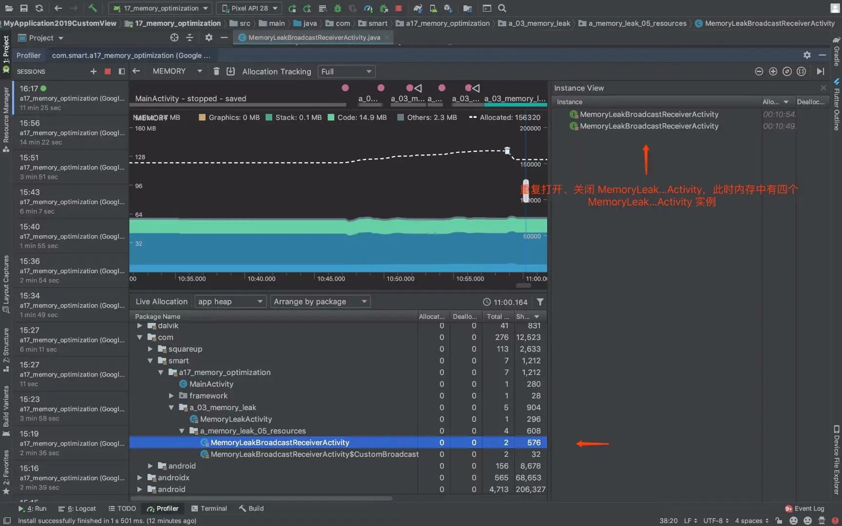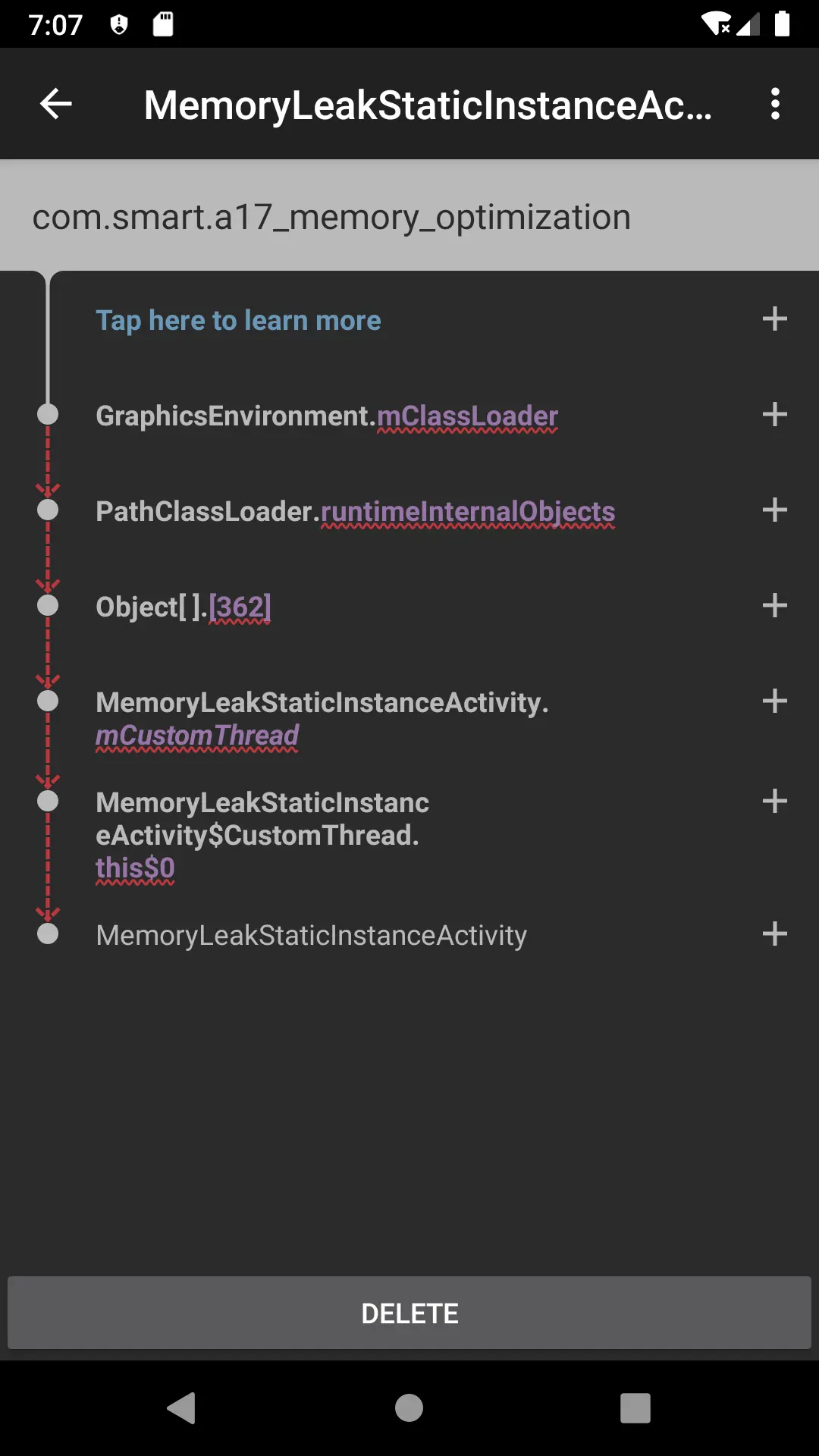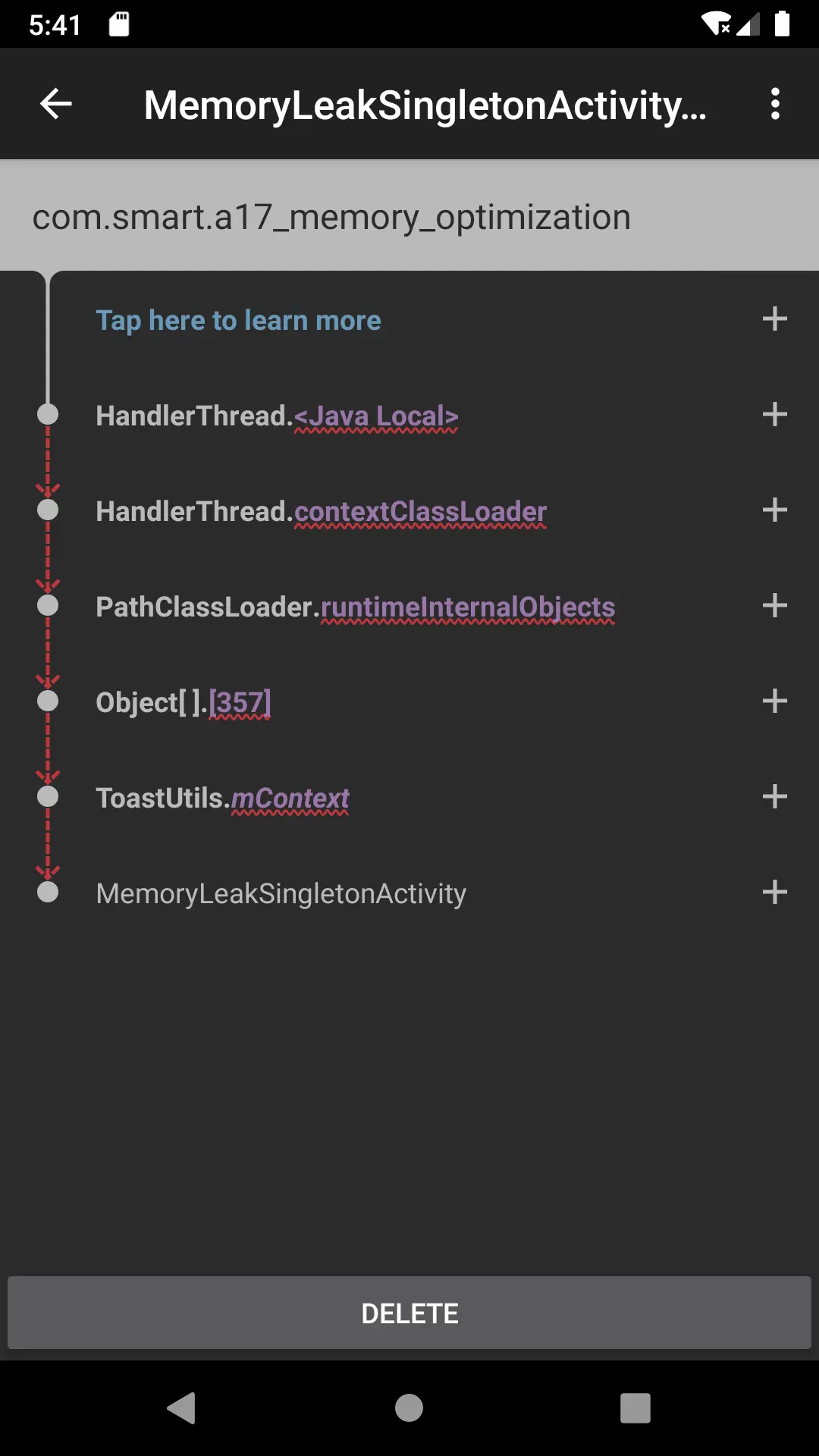 接下来,我们就手动写一个内存泄漏的例子,看下 LeakCanary 能不能检测出来: