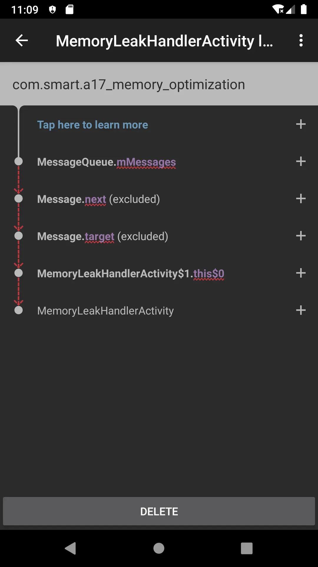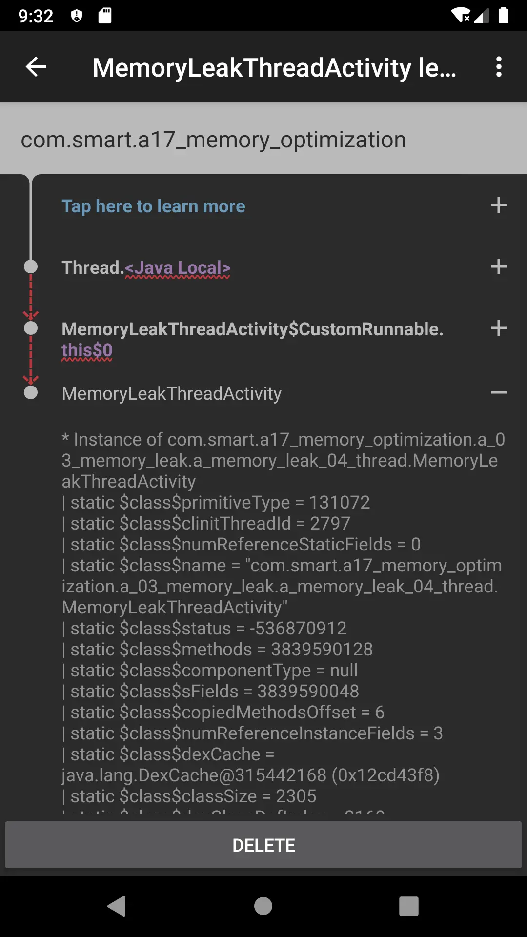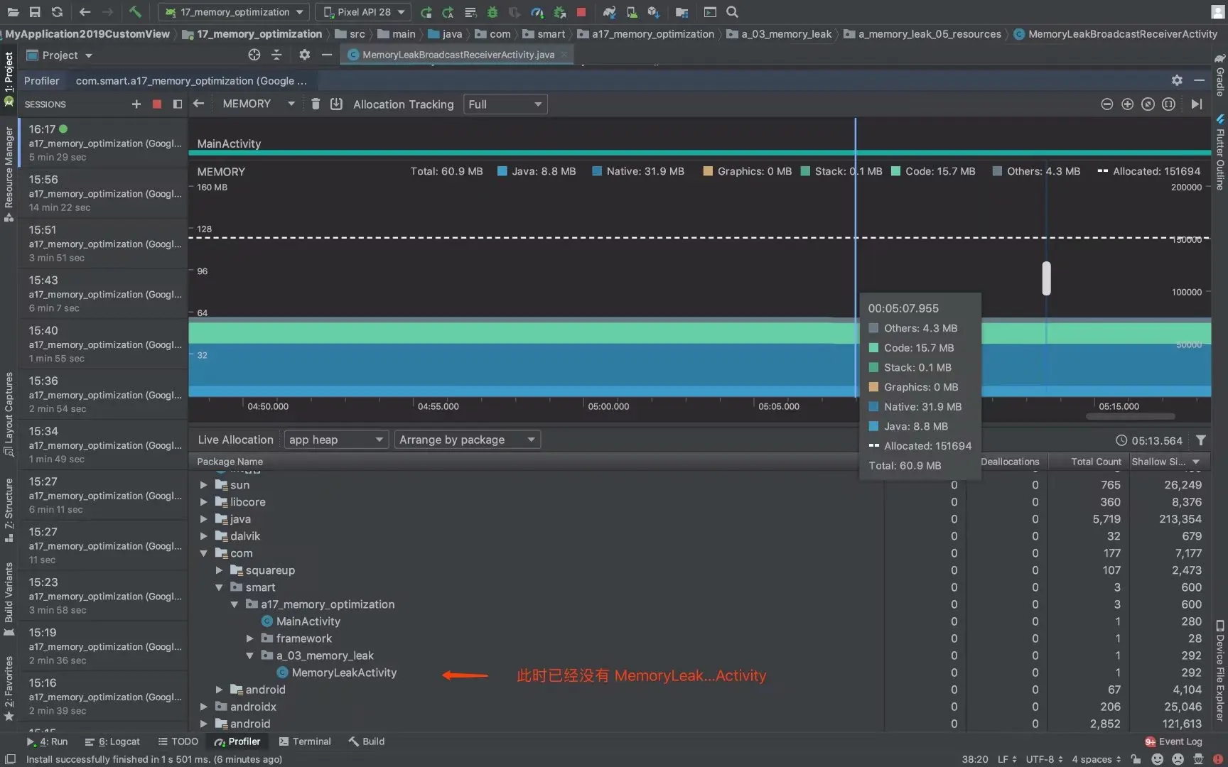 接下来,我们就手动写一个内存泄漏的例子,看下 LeakCanary 能不能检测出来: