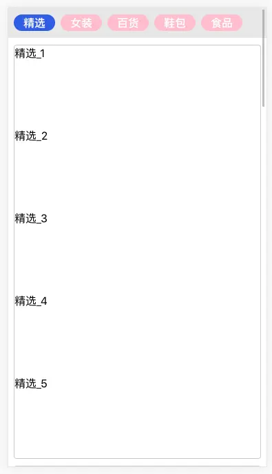 tab => tab_1 ~ tab_5, 对应五个商品列表list_type => tab_list_1 ~ tab_list_5,对应到文档顶部的距离为[d1, d2, d3, d4, d5],demo 中设定:对于 tab_1,其激活的商品列表距离范围为[0, d2],依此类推如下表当前激活的标签 离文档顶部距离范围 对应的商品列表 tab_1 [0, d2] tab_list_1 tab_2 [d2, d3] tab_list_2 tab_3 [d3, d4] tab_list_3 tab_4 [d4, d5] tab_list_4 tab_5 [d5, Infinity] tab_list_5 注意,这个标签对应商品列表距离范围的规则可以根据需要更改