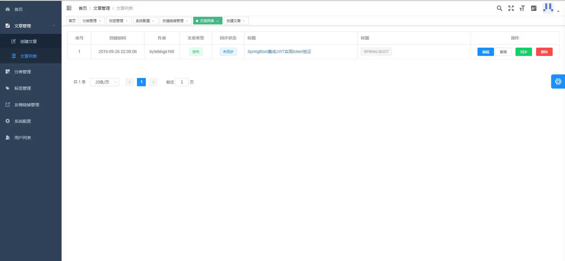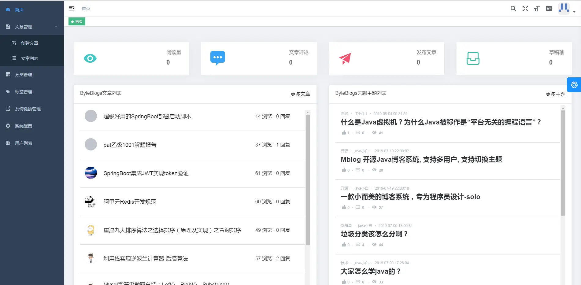 说到为什么会开发这个个人博客,愿意在上半年写了一个多人博客,byteblogs 但是总感觉缺少点什么,最后考虑一下准备写一个个人博客让个人博客的文章可以同步发到byteblogs上去,这个就形成一个圈子。只说不练假把式,于是就开工搞起了。我看了很多的个人博客大都是java + freemaker ,这个做主题是比较好更换的,但是局限性很大,不利于二次开发,而是改一下前端都需要整个重启费时费力。于是我就干脆直接搞个前后分离的博客。
