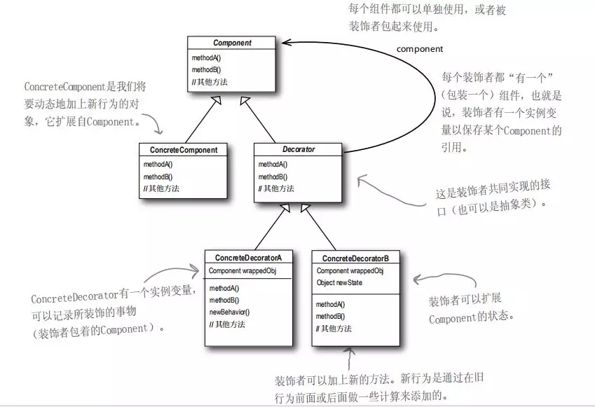 Decorator类,并且里面有一个变量指向Component抽象类