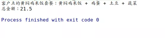 public class App { public static void main(String[] args) { // 点一份米饭 Rice rice = new Rice(); // 加个鸡蛋 Egg egg = new Egg(rice); // 在加土豆 Potato potato = new Potato(egg); // 再加一份白菜 Veg veg = new Veg(potato); System.out.println(veg.getDesc()); System.out.println(veg.cost()); }}测试结果