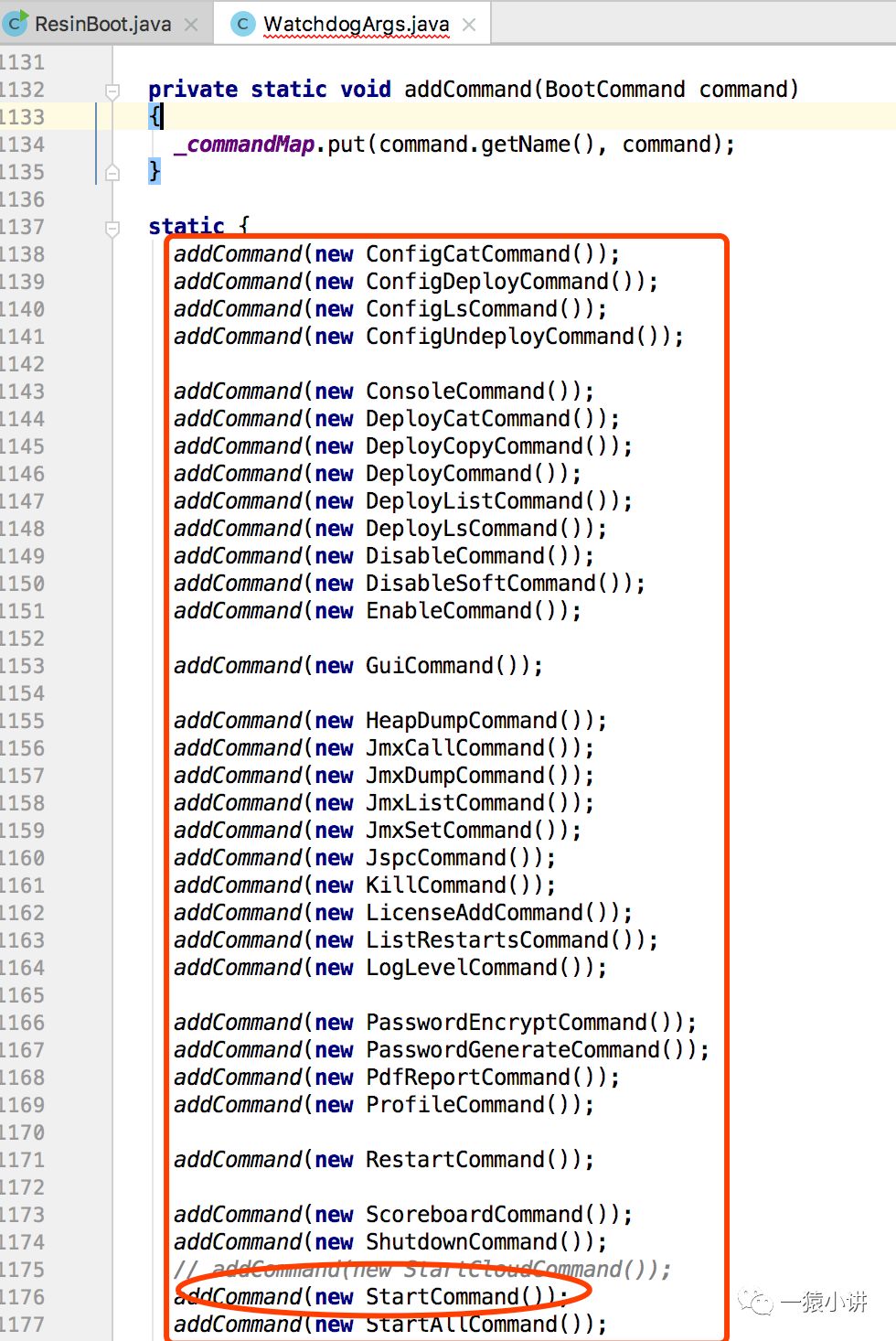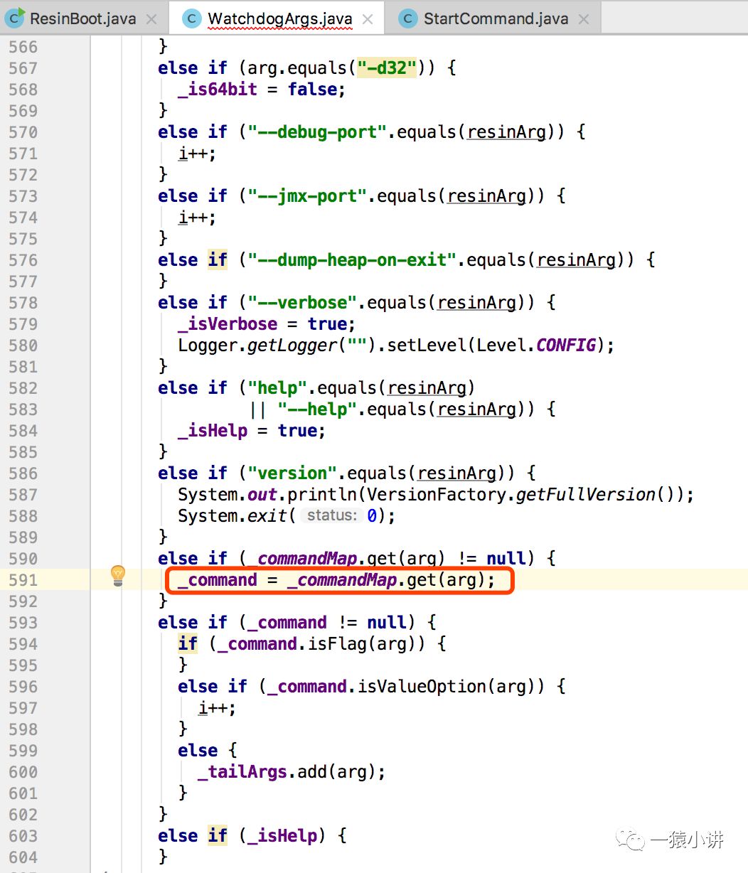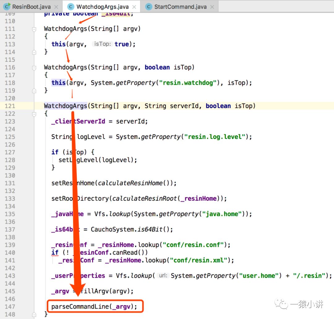 发现 WatchdogArgs 静态代码块中提前预制了一堆命令执行的对象实例,其中就包括 StartCommand,再回头看看它的构造方法,会发现会进行解析咱们 main 函数传入的 args 入参,然后根据入参获取对应的命令执行对象。