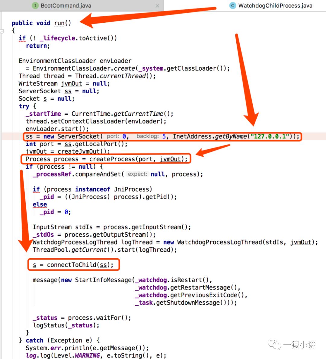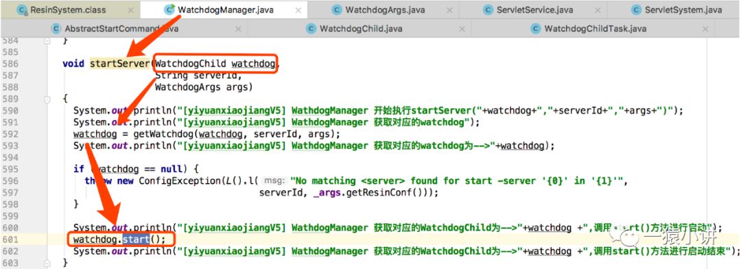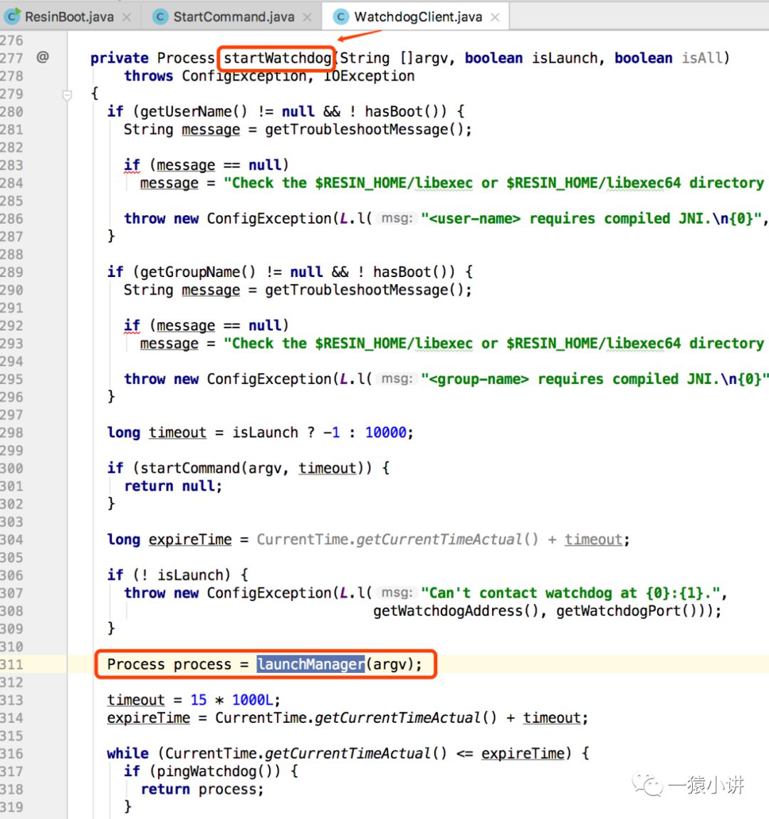 至此,ResinBoot 通过 ProcessBuilder.start() 成功触发启动 WatchdogManager 进程,也就是咱们猜测的大总管进程,哪丫鬟进程是否也存在呢? 丫鬟进程又是怎么启动的呢?