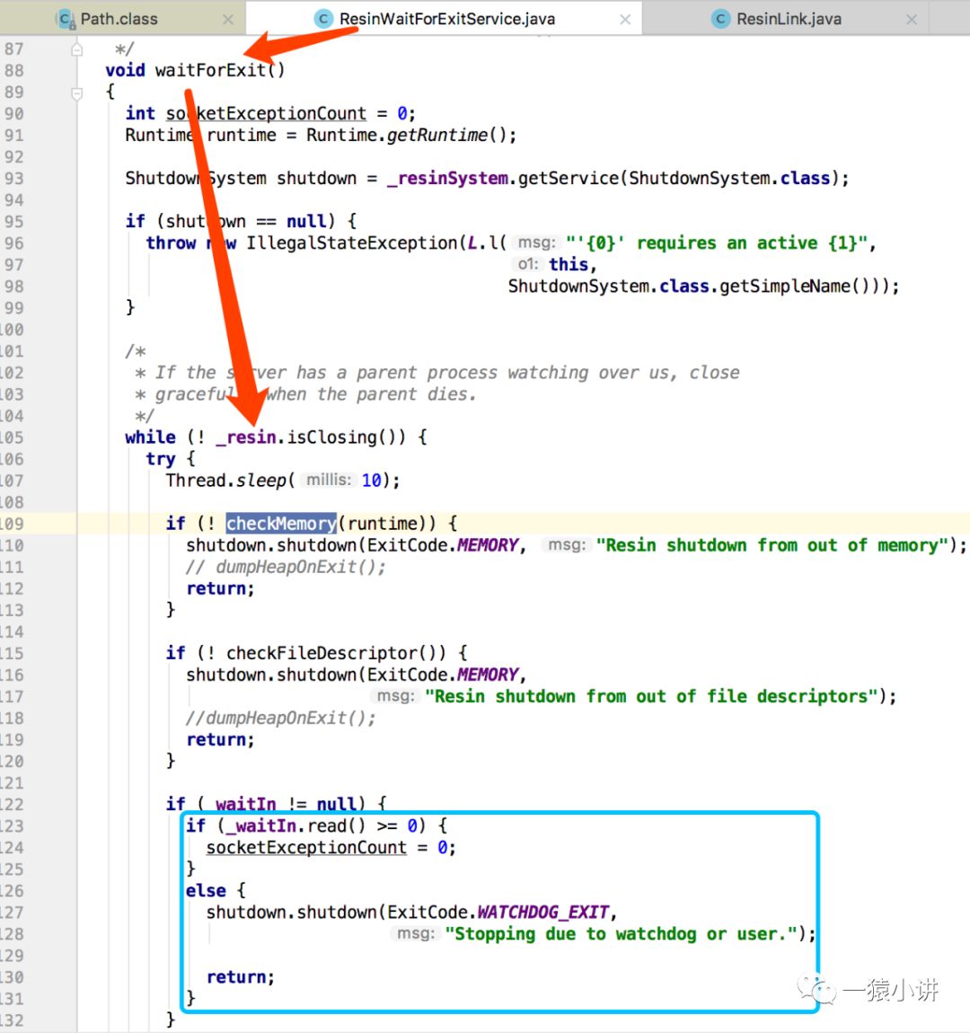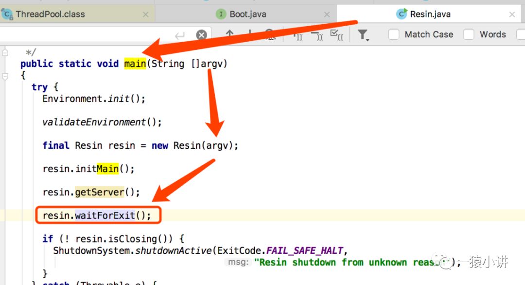 那 Resin 进程又干了啥? 我们依然从 main 函数开始看起。 一目了然根据传入参数创建 Resin 实例,然后重点关注一下 waitForExit,这个是不是和咱们猜测的丫鬟进程与大总管进程通讯不上就退出,是不是这么回事呢?