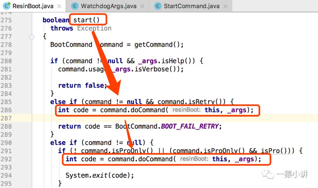 那我们也一起看看 ResinBoot 的 start 方法做了些什么操作? 发现方法中获取对应的 command,然后调用 command.doCommand() 方法。