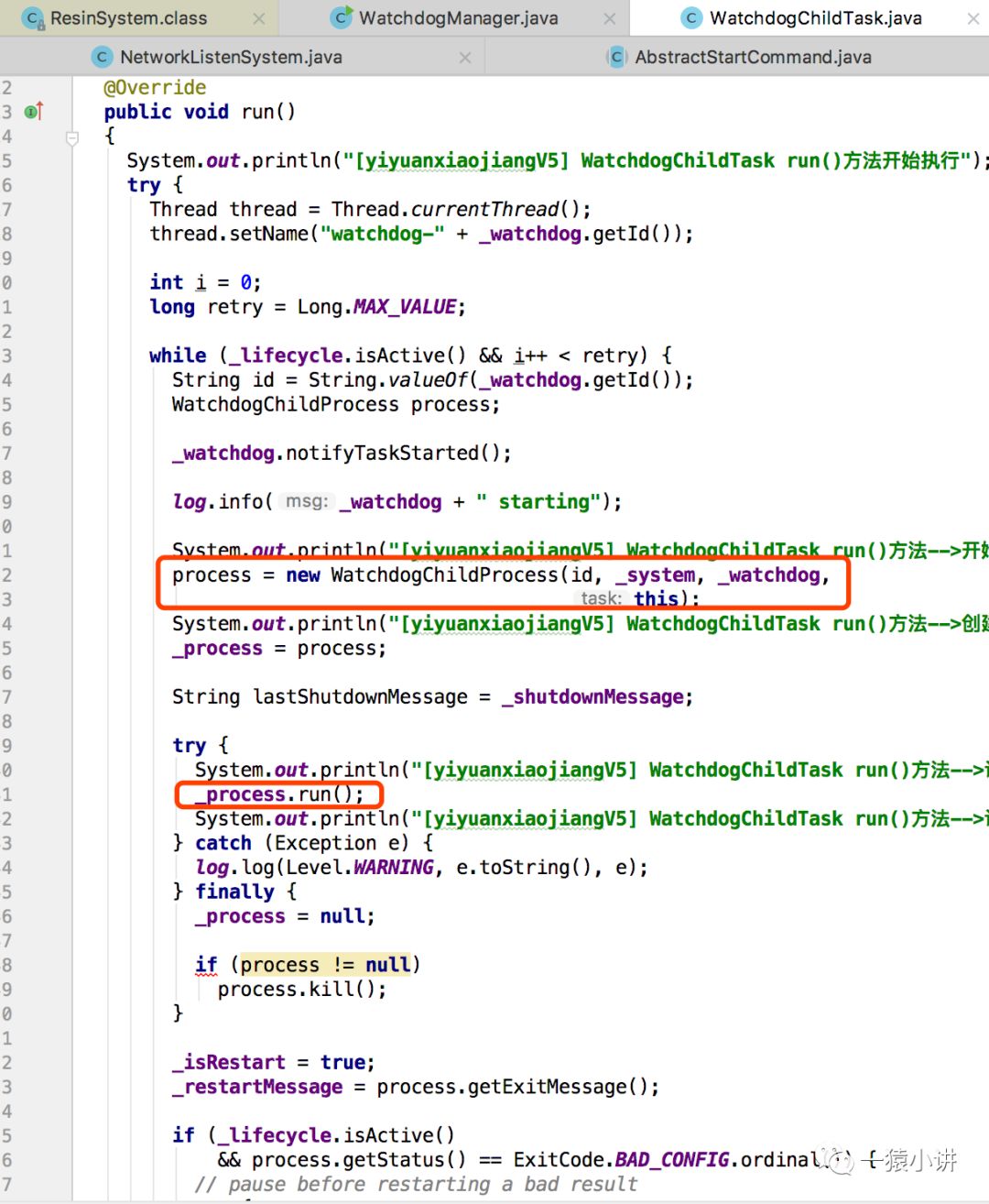 重点再一次来临,会发现线程体中创建了一个 WatchdogChildProcess 对象实例,接着调用对象的 run 方法。此处就是保证了 Resin 应用为什么一直杀不死的原因,有个循环调度,一旦子进程有问题,立即再次进行创建子进程。