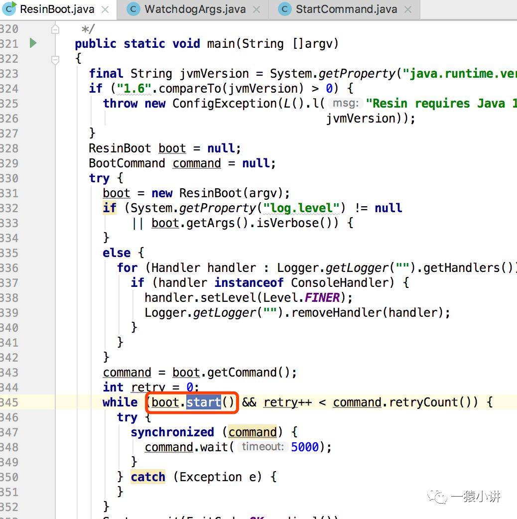那么我们再回头看看 ResinBoot 的 main 函数,发现又调用了 ResinBoot 的 start 方法。