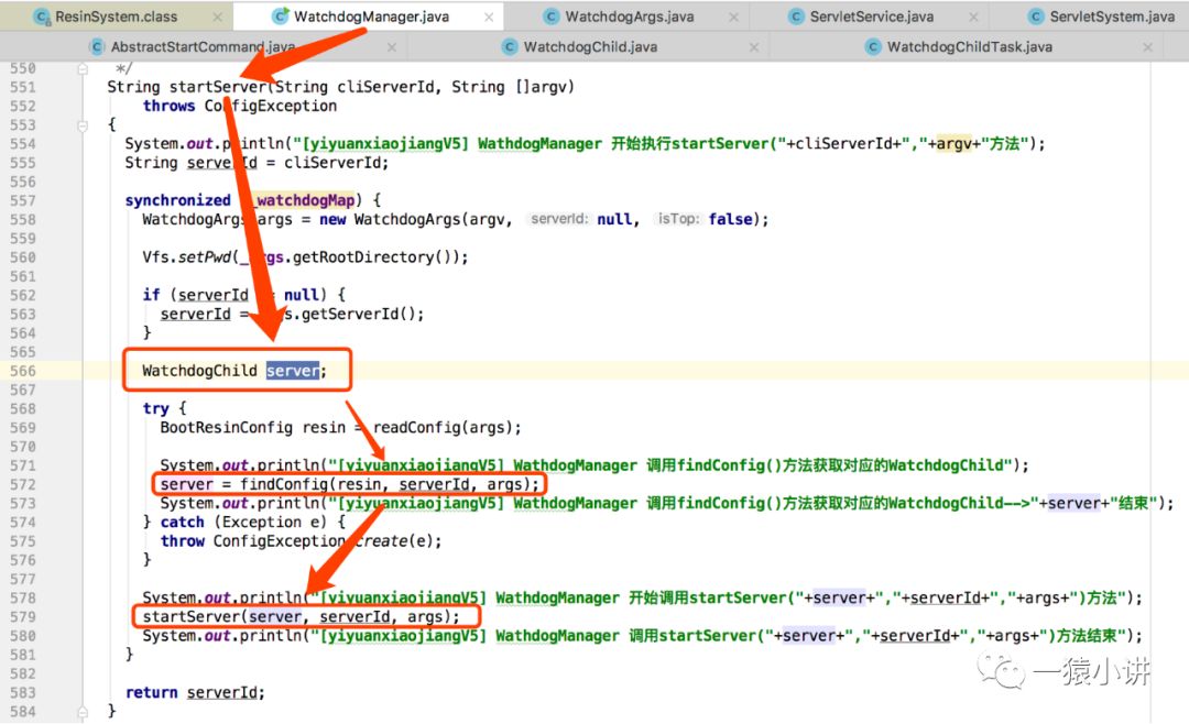 并且第 539 行有一句日志输出,和咱们在控制台输入 ./resin.sh start 命令启动 Resin 服务时的日志不谋而合。