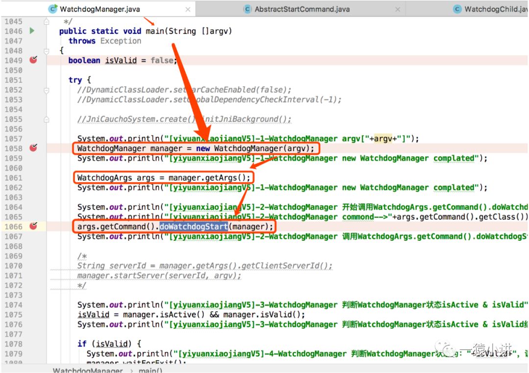 此时我们跟随源码设计的脚步,继续向下刨一刨 WatchdogManager,发现 WatchdogManager 程序入口 main 函数中,根据传入参数构建了 WatchdogManager 对象,并通过参数获取对应的 XxCommand(似曾相识的感觉),然后通过 XxCommand 调用 doWatchdogStart 函数完成服务的启动。