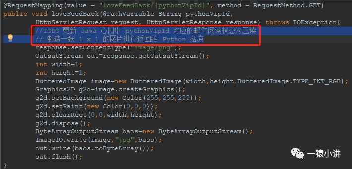 追踪 Python 菇凉的流程没毛病,Java 那小子能够正常判断 Python 菇凉是否读取了祝福贺卡邮件,但是由于 Python 菇凉收取爱的邮件百宝箱的版本不同,会导致有些埋藏的图片却无法隐藏,一旦展示将导致爱情局面无法挽回,所以 Java 那小子还需要在服务口真正的返回一张 1 x 1 的样式为不可见的图片。