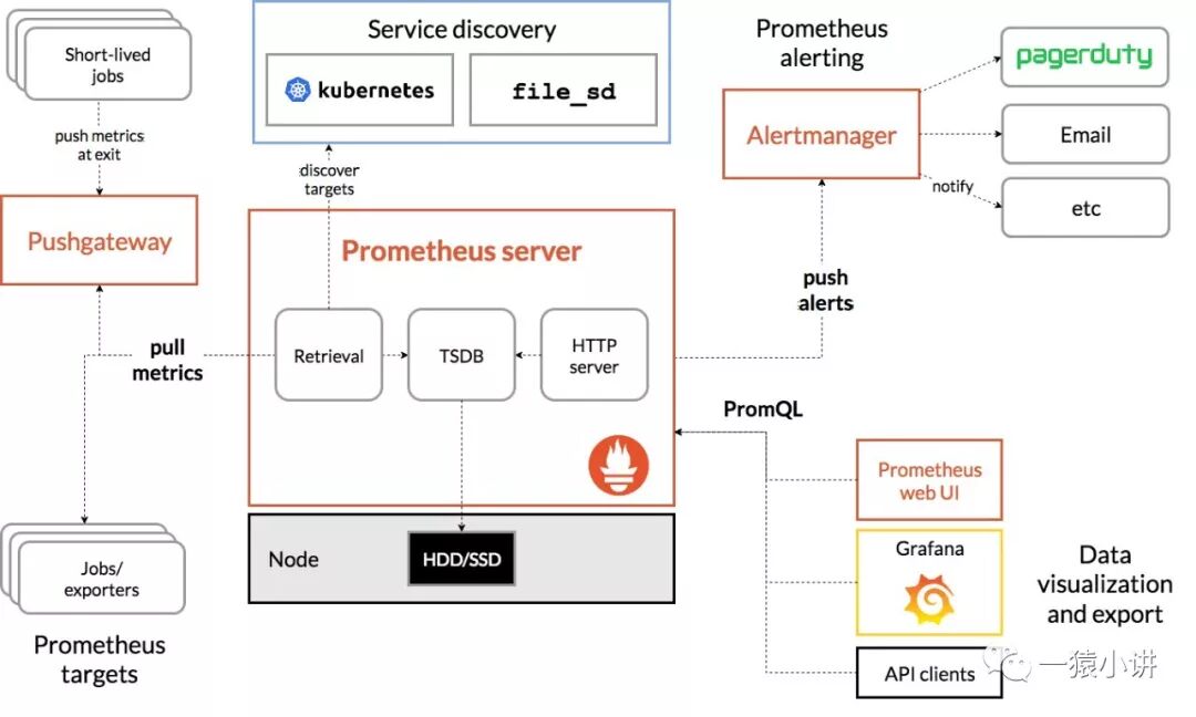 如上面官方架构图所示,能看出 Prometheus 的生态中主要是由 exporters、Pushgateway、Prometheus server、AlertManager、Prometheus web UI 几个套件组成。