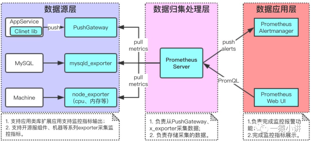 如上图所示,我简单把 Prometheus 的生态划分为数据源、数据归集处理、数据应用三大层。