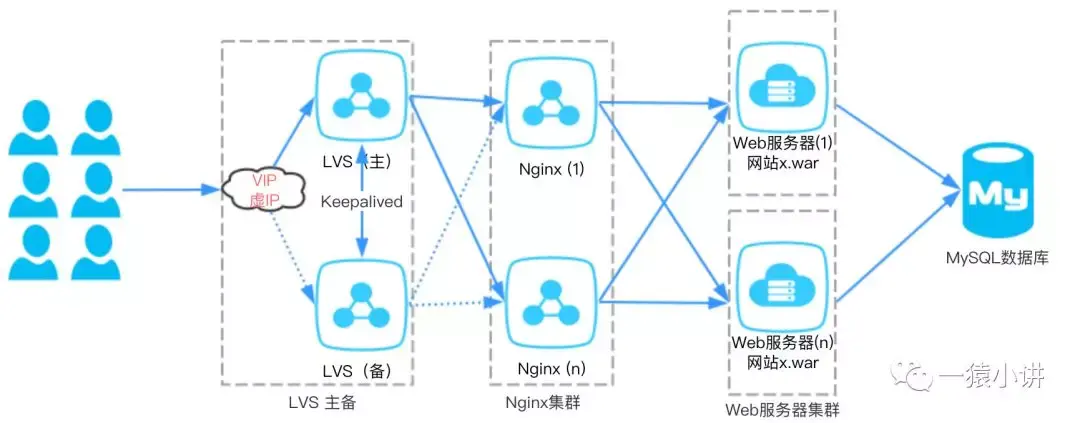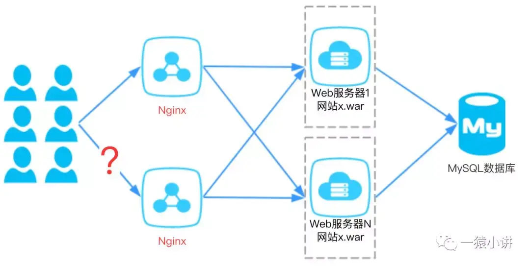 程序猿再三思考一二。如上图所示:那就站在尼古拉斯赵四的肩膀上,再部署一个Nginx专门用来做分发,那问题不就解决了么。Web 应用服务器部署的问题是解决了,但是却引入了另外一个问题,如果做分发的Nginx挂了,咋办呢?