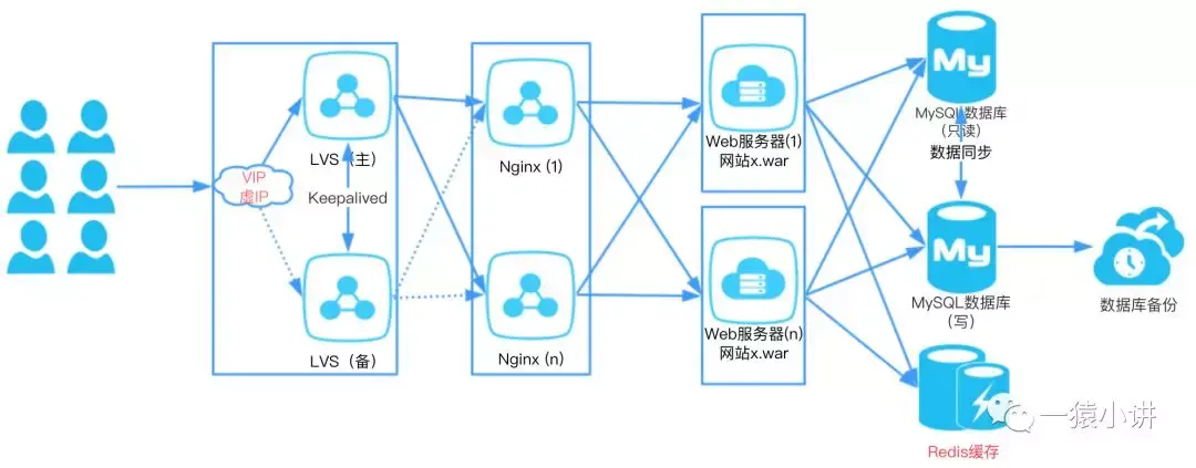 到目前为止你对应用架构集群的部署就了解差不多了,随着业务的逐日增多,其中Nginx集群可以横向扩展、Web服务器也是可以横向扩展,但是 MySQL 数据库势必会成为瓶颈,那该怎么办呢?