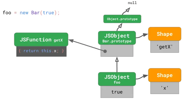 Bar.prototype,检查他的的shape,有getX方法。 也就是一个简单的读取需要进行1+2N(N表示找到方法需要的原型链的个数)次查找,1次自己本身的shape,不存在找到原型,然后在检查原型的shape。 3次检查在这里看起来似乎可以接受,但是当我们操作DOM元素的时候const anchor = document.createElement('a');DOM有6层的原型链。