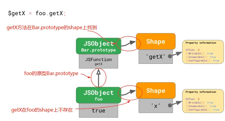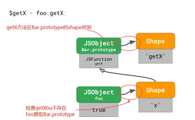 回到前面的例子foo.getX,如果我们能把原型的查找的和方法的查找包裹在一起做就好了。js引擎通过把原型链的指针从实例本身转移到他的shape上实现了这一操作