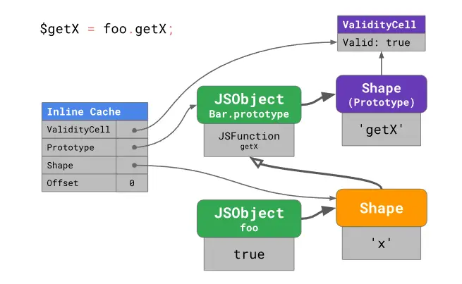 之前提到,prototype的shape无法和别的对象共享,就是因为每个prototype的shape有一个特殊的ValidityCell字段。这个ValidityCell字段标识了是否有人修改了原型对象。同时为了让查找更快js引擎也加入了inline cache。