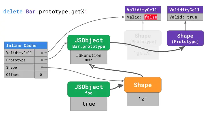 但是如果你修改了原型对象,比如delete Bar.prototype.getX在原型对象上删掉了getX方法。这个时候原型的shape对象会被重新分配,ValidityCell也会变成false,当下一次使用inline cache的时候也通不过检查从而得不到offset的缓存了,这会影响性能。
