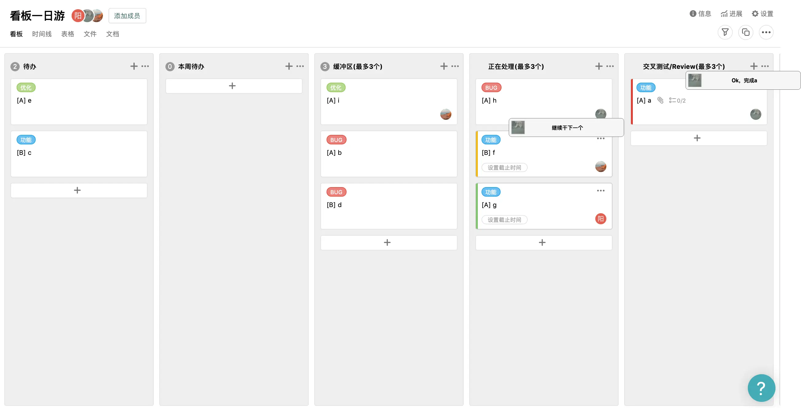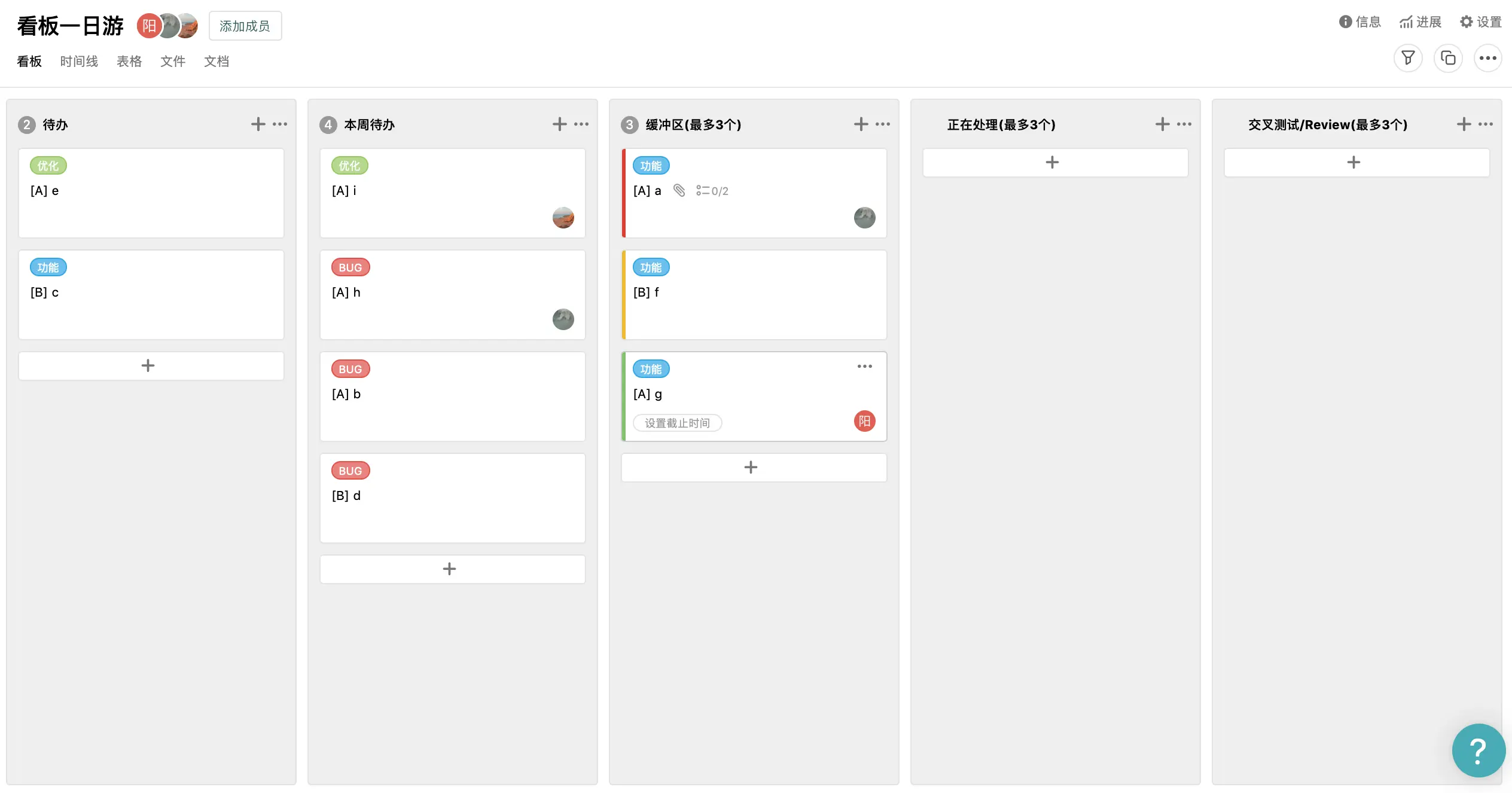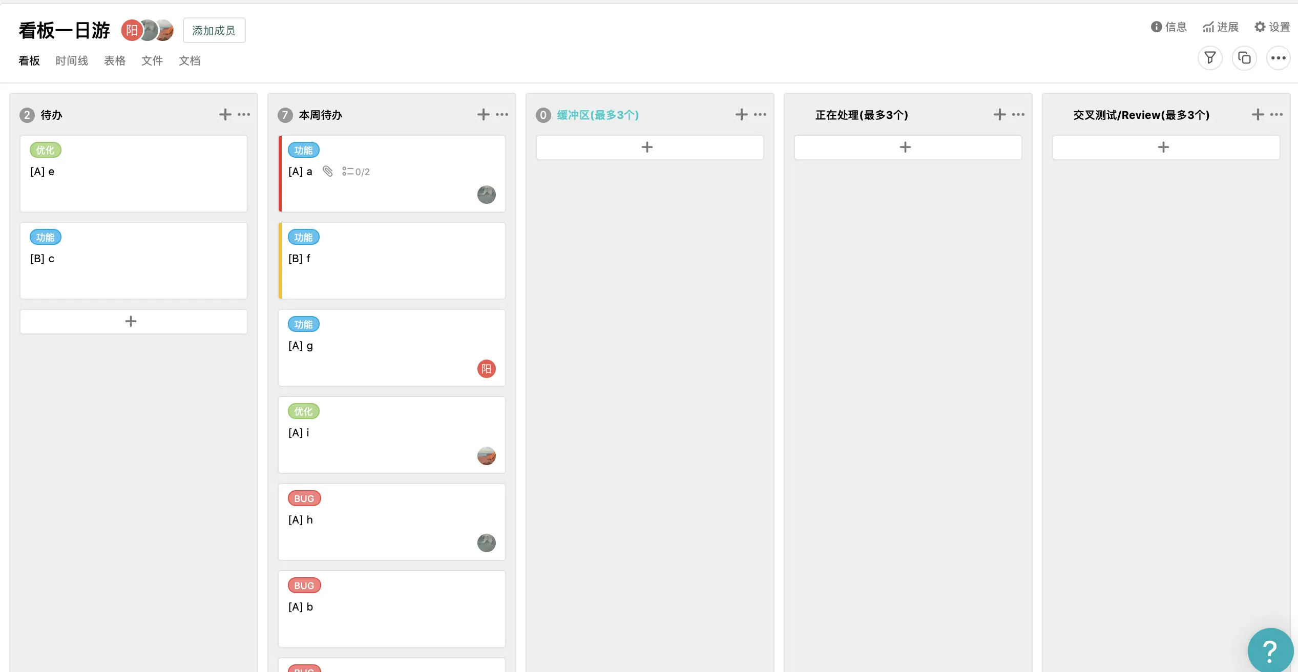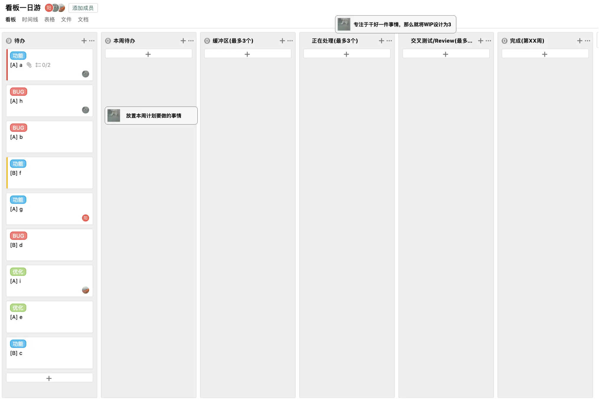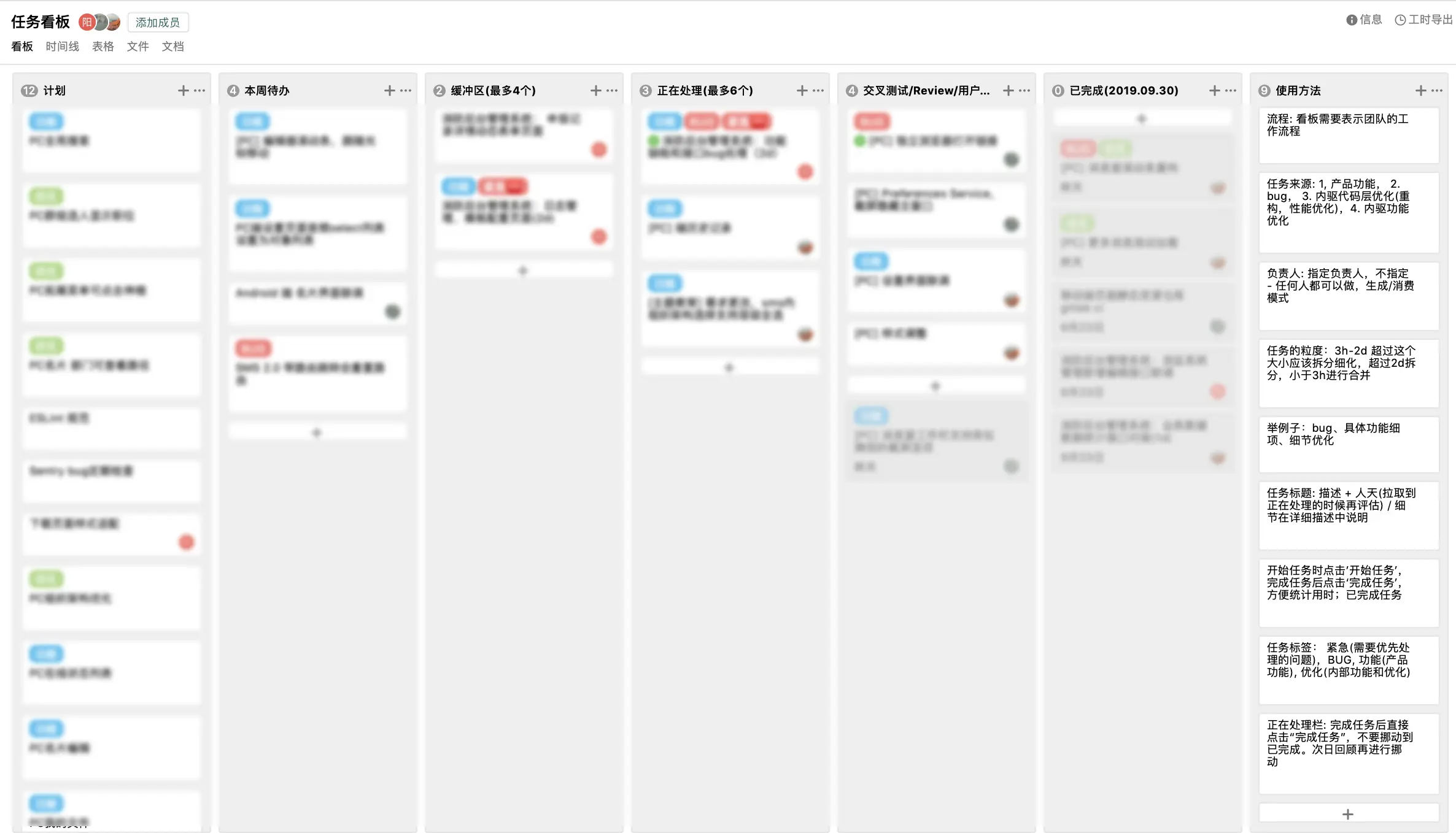 上面我们团队看板中,有几个比较特殊的栏: 计划/本周待办/缓冲区。主要栏主要目的是为了给任务划分优先级,让团队专注于目前应该优先处理的任务。