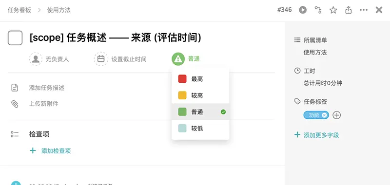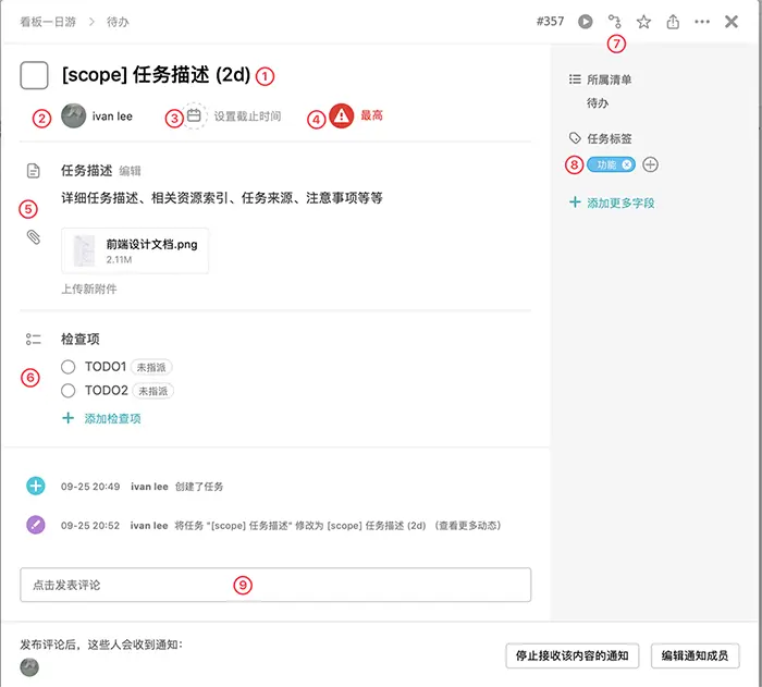 - ⑧ 任务标签: 可以指定任务的类型,例如功能、Bug、优化、重构