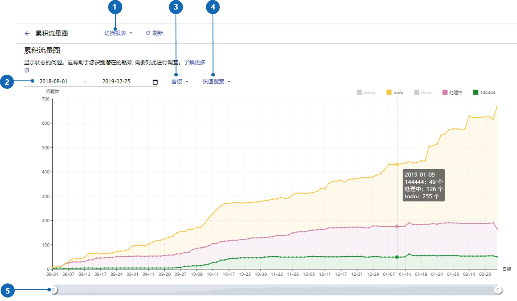 累计流量图统计每一天每一栏的在制品数量。从而可以反映不同环节任务处理速率,以及暴露环节之间的瓶颈: