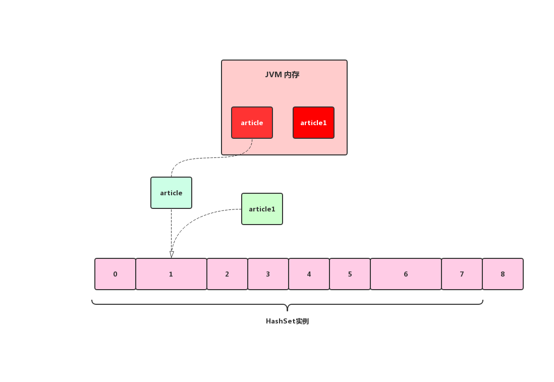 由于我们只重写了 equals 方法并没有重写 hashcode 方法,所以两篇文章的 hashcode 值不一样,这样映射到数组的位置就不一样,调用 set.contains(article1) 方法时,在哈希表中的情况可能如下图所示: