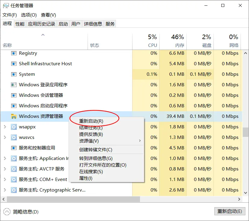 5、打开任务管理器,重启windows资源管理器
