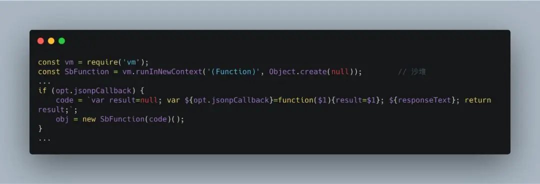 通过runInNewContext返回沙箱中的构造函数Function,同时传入切断原型链的空对象防止逃逸,之后再外部使用的时候,只需要调用返回的这个函数,和普通的new Function一样调用即可。