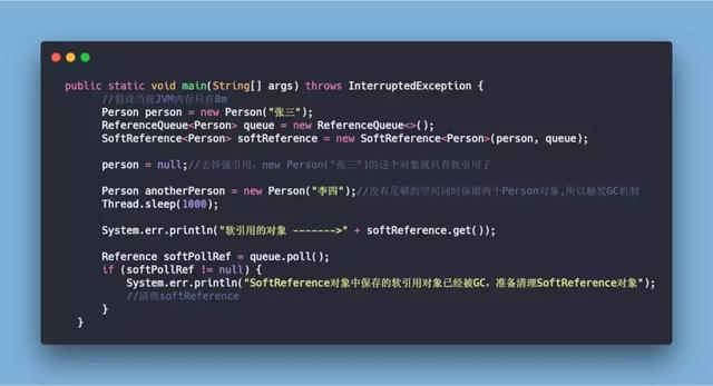 - 因此,Java提供ReferenceQueue来处理引用对象的回收情况。当SoftReference所引用的对象被GC后,JVM会先将softReference对象添加到ReferenceQueue这个队列中。当我们调用ReferenceQueue的poll()方法,如果这个队列中不是空队列,那么将返回并移除前面添加的那个Reference对象。