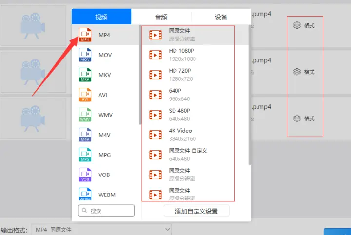 3、然后点击输出格式中的格式按钮设置输出的视频格式和视频分辨率,需要注意的是把输出格式设置为需要的mp4格式,分辨率则根据需要提高或降低。