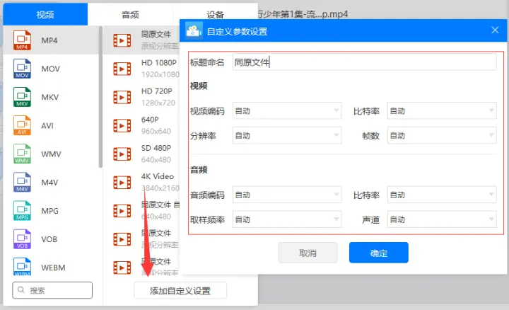 4、之后如果想自定义视频和音频参数可以点击添加自定义设置按钮设置视频下的视频编码、比特率、分辨率、帧数和音频下的音频编码、比特率、取样频率、声道等参数。