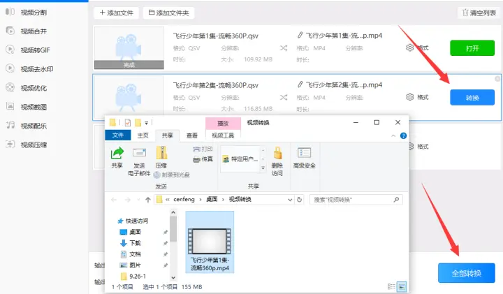 5、最后点击全部转换按钮就可以把添加好的qsv视频根据所设置的参数转换成mp4视频并输出到所设置的输出路径中,接下来既可以到输出路径中找到转换后的文件了。