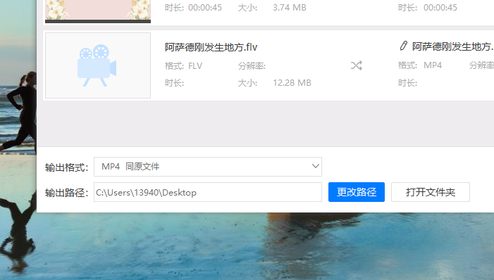 2、然后还需要添加一个保存转换视频mp4的位置,这里直接将视频设置成桌面上保存就行了。直接点击更改路径就可以重新设置了,但是也可以将地址直接复制到地址栏中也可以快速修改。