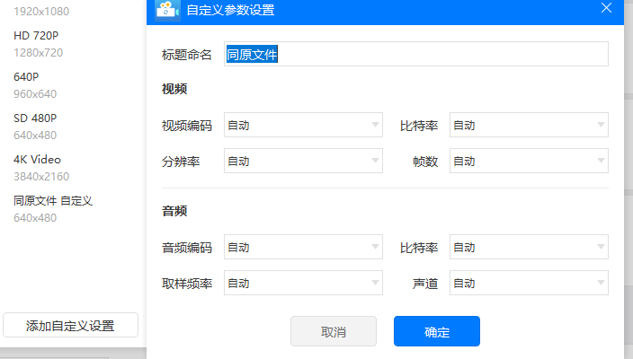 4、当然如果软件提供的文件格式和分辨率并不是你所需要的,那么可以点击添加自定义设置,然后在那里设置更多的属性参数,有分辨率、取样频率、帧数、声道等各种各样的参数可供选择。