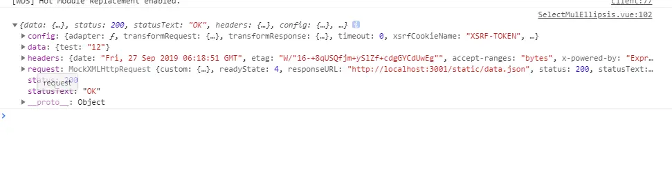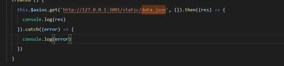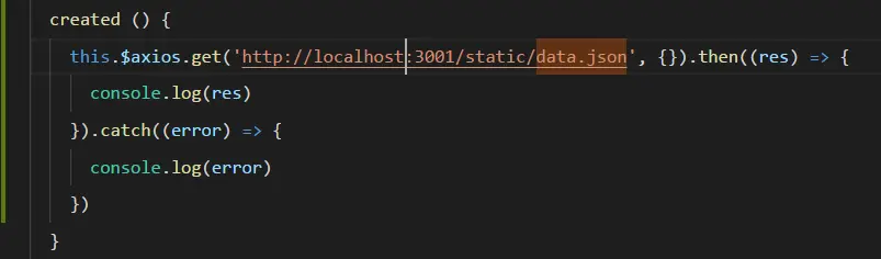 axios请求本地json文件 veriazzzz 2019-09-27 5,408 阅读1分钟 项目结构 data.json文件存放在与src同级的目录下,参考axios请求本地json文件所说,static是vue-cli内置服务器向外暴露的静态文件夹 当然,获取json文件用get方法才行,post方式是不可行的。 接下来看代码: 正确的应该是通过ip方式获取: 以上两种方式都可以,但是一定要和node服务器起的ip、端口、协议对上,否则被认为是跨域请求,不予许访问。 控制台输出