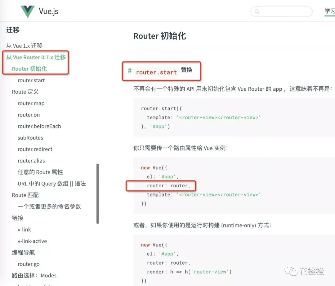 从这个版本以后呢 vue-router 更新了启动方式(同时也优化了很多其他的方法),变成了现在传递 opitons 的这个样子: