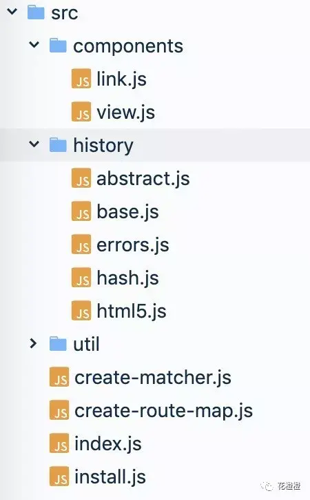vue-router 的代码还是很好理解的,整体关键逻辑不多。components 和 history 分别是我们使用的组件还有浏览历史控制。我们关心的就在 index.js、install.js 里了: