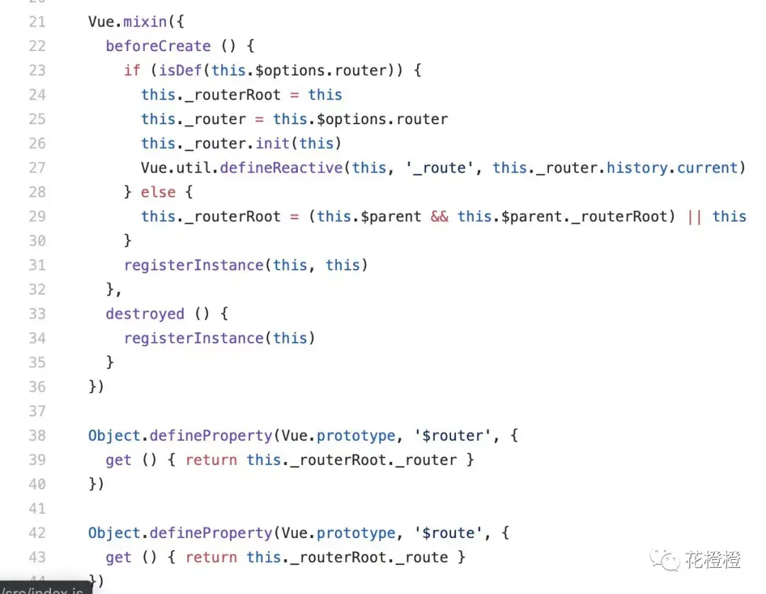 对,你没有看错!就是这个 mixin 方法,在 beforeCreate 生命周期里 vue-router 从当前 vue 实例的 options 中获得获得 router 对象并完成初始化操作。