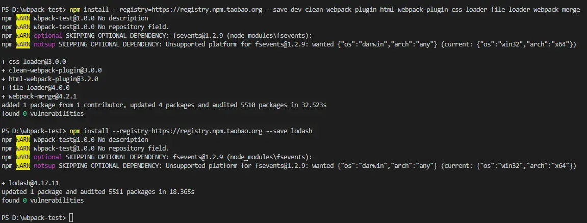 install --registry=https://registry.npm.taobao.org --save-dev clean-webpack-plugin html-webpack-plugin css-loader file-loader style-loader webpack-merge