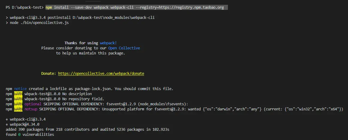 这个配置是为了解决国内用户下载npm模块速度慢,以及有时候会下载失败的可能 安装webpack和webpack-cli(这两个插件缺一不可,webpack是打包工具,webpack-cli是处理打包命令的webpack自带的方便用户的脚手架) 执行命令成功之后的效果: