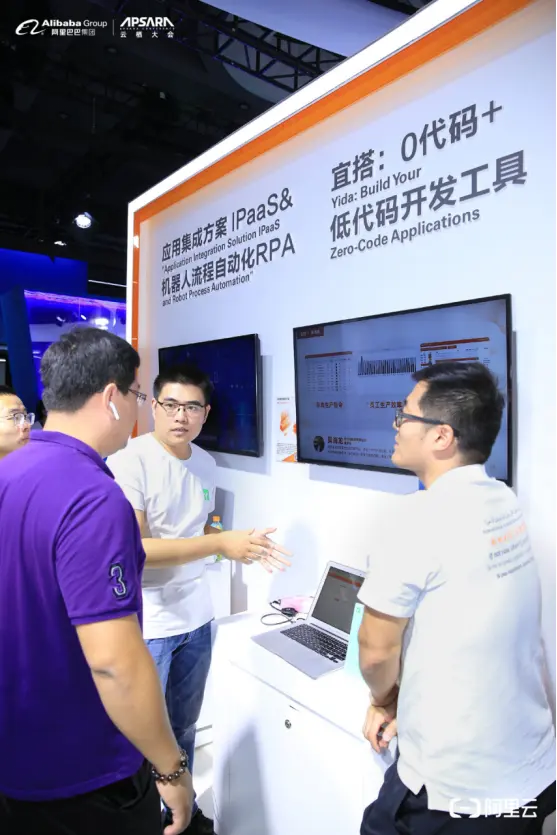 在今年云栖展台上,一个“不用写代码也能开发应用”的产品也吸引了大批到场嘉宾目光。不少观众甚至上手“玩”起应用拼搭。最快30秒就搭建了一个审批流程。