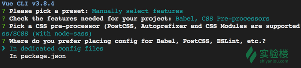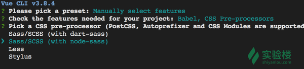2.Check the features needed for your project 选择 Babel 和 CSS Pre-processors 两项(使用空格键来选中或取消)