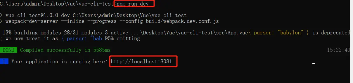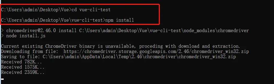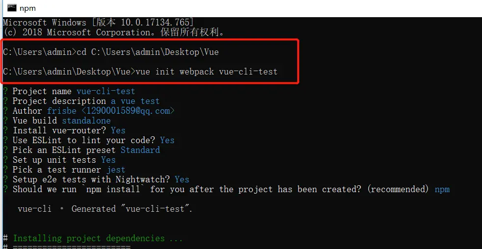 - 配置完成之后,Vue目录下面多了一个vue-cli-test的文件夹,进入文件夹,下载依赖
