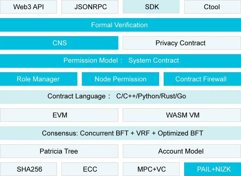 支持WebAssembly虚拟机、提供高度优化的BFT类共识算法、提供更高效的数据存储机制。