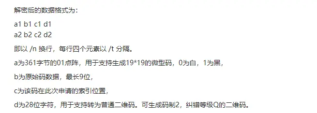 在我们处理好所有的二维码包数据后,就可以将文件发给印刷厂进行印刷,那边会有解析程序解析二维码,作为开发只要关心9位的原始码数据即可,也是后面我们进行扫码操作时要用到的数据。